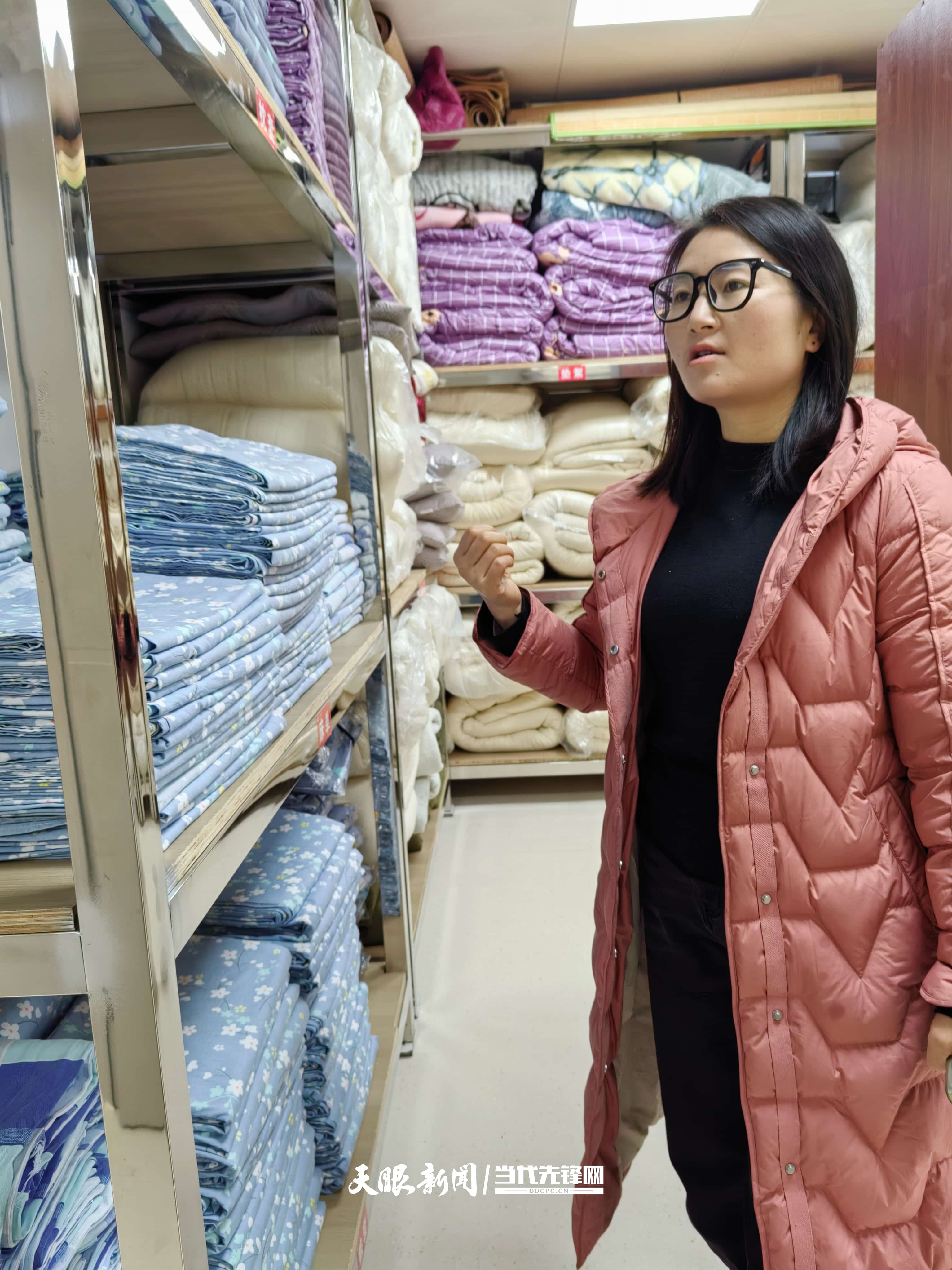 冬日的暖阳透过窗户,洒进龙塘镇敬老院的储藏室。院长谭芳正细致地整理着陈列柜上新到的床单与被套,手指轻抚过天蓝色布料上面散落着的细小白花。