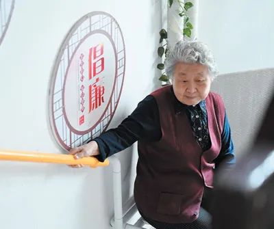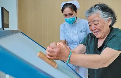 位于河北省秦皇岛市海港区海阳镇的秦皇燕达金色年华健康养护中心内,工作人员指导老人做康复训练。曹建雄摄(影像中国)