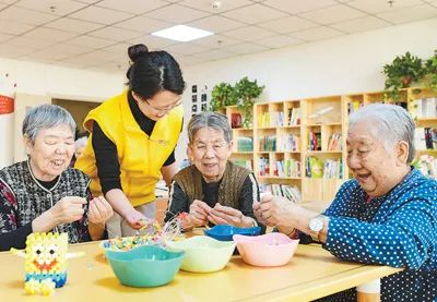 内蒙古自治区呼和浩特市赛罕区人民路街道仕奇居家社区养老服务综合体中,志愿者陪伴老人们进行手工艺品制作。王正摄(影像中国)