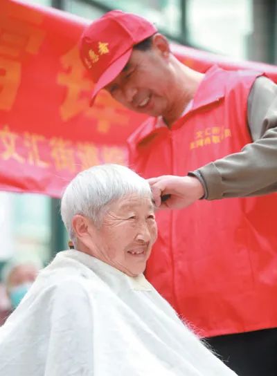 江苏省扬州市春江社区的志愿者给老年人理发。孟德龙摄(影像中国)