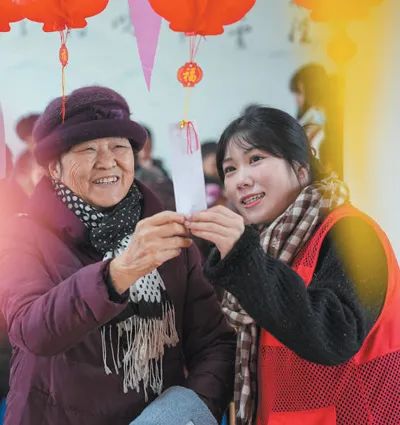浙江省湖州市长兴县夹浦镇丁新村,工作人员在居家养老服务中心与老人们一起共度节日。陈海伟摄(影像中国)