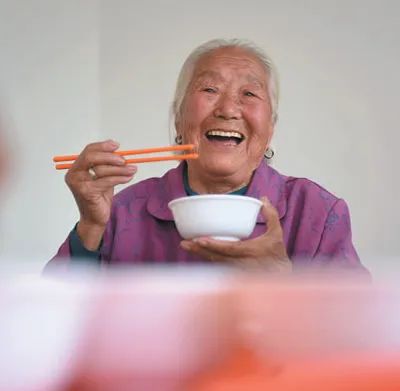 一位老人在山东省淄博市沂源县历山街道寨里村“幸福家园”老年人食堂里吃午饭。赵东山摄(影像中国)