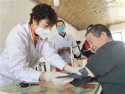 新疆维吾尔自治区塔城地区沙湾市柳毛湾镇,专业服务团队的医生上门为老年人量血压、测血糖,检查身体。王芳吉摄(影像中国)