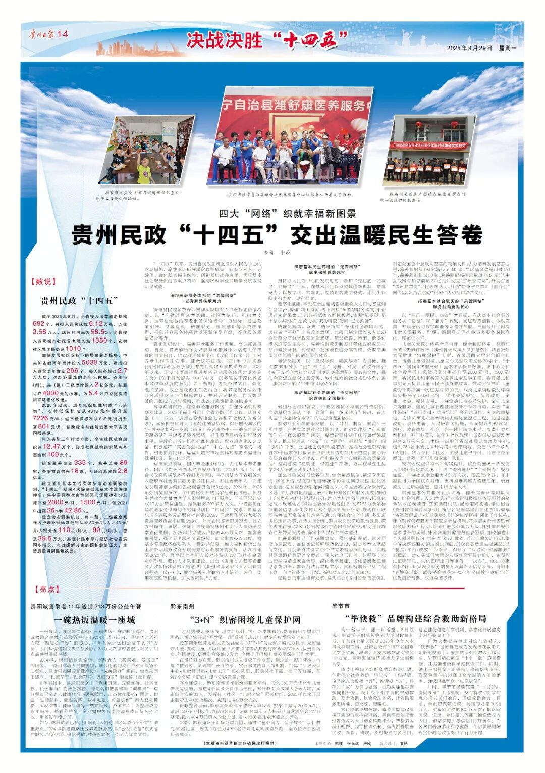 “十四五”以来,贵州省民政系统坚持以人民为中心的发展思想,聚焦巩固拓展脱贫攻坚成果、积极应对人口老龄化、强化基本民生保障、创新基层社会治理、优化基本社会服务供给等重点领域,推动民政事业高质量发展取得明显成效。