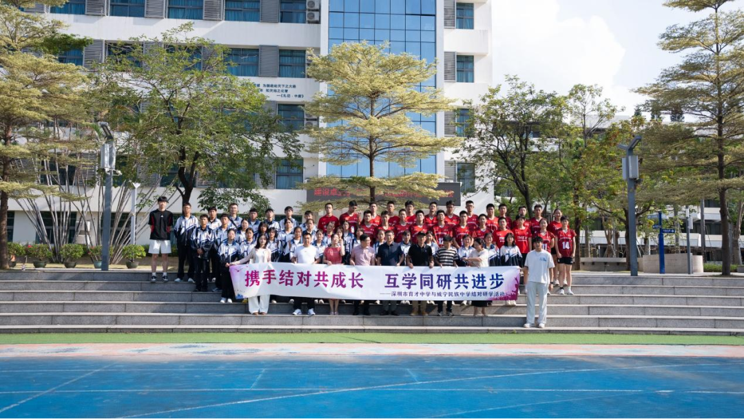 排球运动是深圳育才中学的“闪亮名片”。作为学校的特色课程,育才排球队在省、市级各类赛事中屡创佳绩,斩获多项冠军,“永不言败”的排球精神早已融入校园血脉。为让威中学子深切感受这份精神力量,研学活动特意安排了排球体验课。课堂上,育才排球队队员采用“一带二”的结对模式,耐心示范传球、垫球等动作要领。威中学子认真模仿、反复练习,汗水浸湿了衣衫却依旧劲头十足;育才学子细致指导、及时纠错,用鼓励的话语点燃伙伴的热情。最终,一场酣畅淋漓的友谊赛为这堂特殊的课程圆满画上句号。大家坚信,此刻挥洒在球场上的每一滴汗水,都将浇灌出成长的种子,在未来的日子里生根发芽、拔节生长。