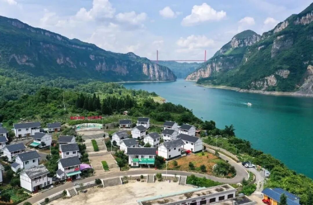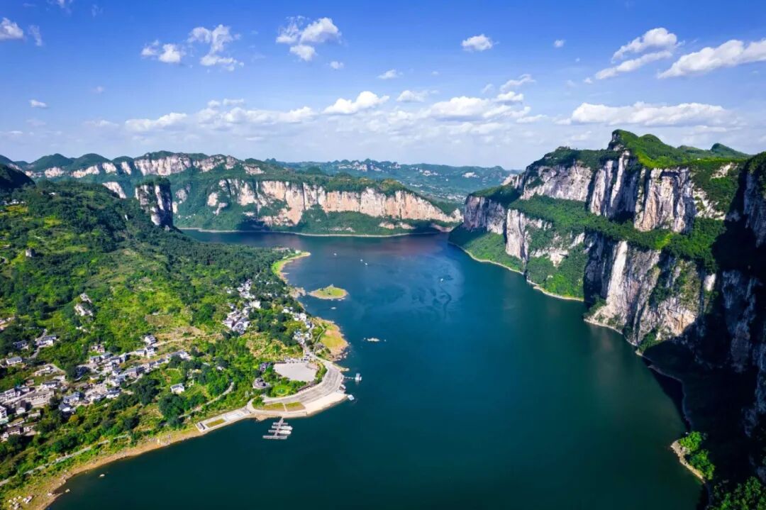 化屋村位于乌蒙山腹地、乌江峡谷深处,是乌江源百里画廊核心景区东风湖畔的一个苗族村寨。原名“化屋基”,苗语意为“悬崖下的村寨”。背后是绵延的悬崖,面前是开阔的江水,地理位置得天独厚。村里统一规划的小楼错落有致,与自然环境完美融合。如果你站在村子高处的观景台俯瞰,青山排闼,峭壁如斫,乌江源百里画廊的壮阔景致尽收眼底。