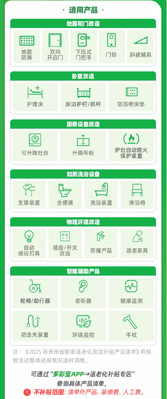 补贴专款专用,适用于提升老年人居家安全与生活便利的产品,主要包括以下六大场景(具体产品以“多彩宝”APP内《补贴产品清单》为准):