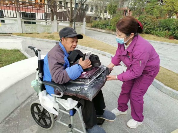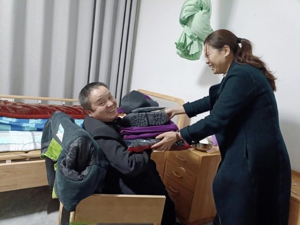 购买衣物前期,敬老院工作人员先逐一对院内老人的身高、体形进行细致测量,建立个性化衣物尺寸台账,根据老人身体特点定制棉衣、棉裤、保暖鞋等物资,确保每件衣物合身保暖。发放现场,工作人员热情地为老人分发新衣,耐心帮助行动不便的老人试穿调整,同时叮嘱老人注意防寒保暖、保重身体。老人们身着崭新暖和的衣物,脸上洋溢着幸福的笑容。