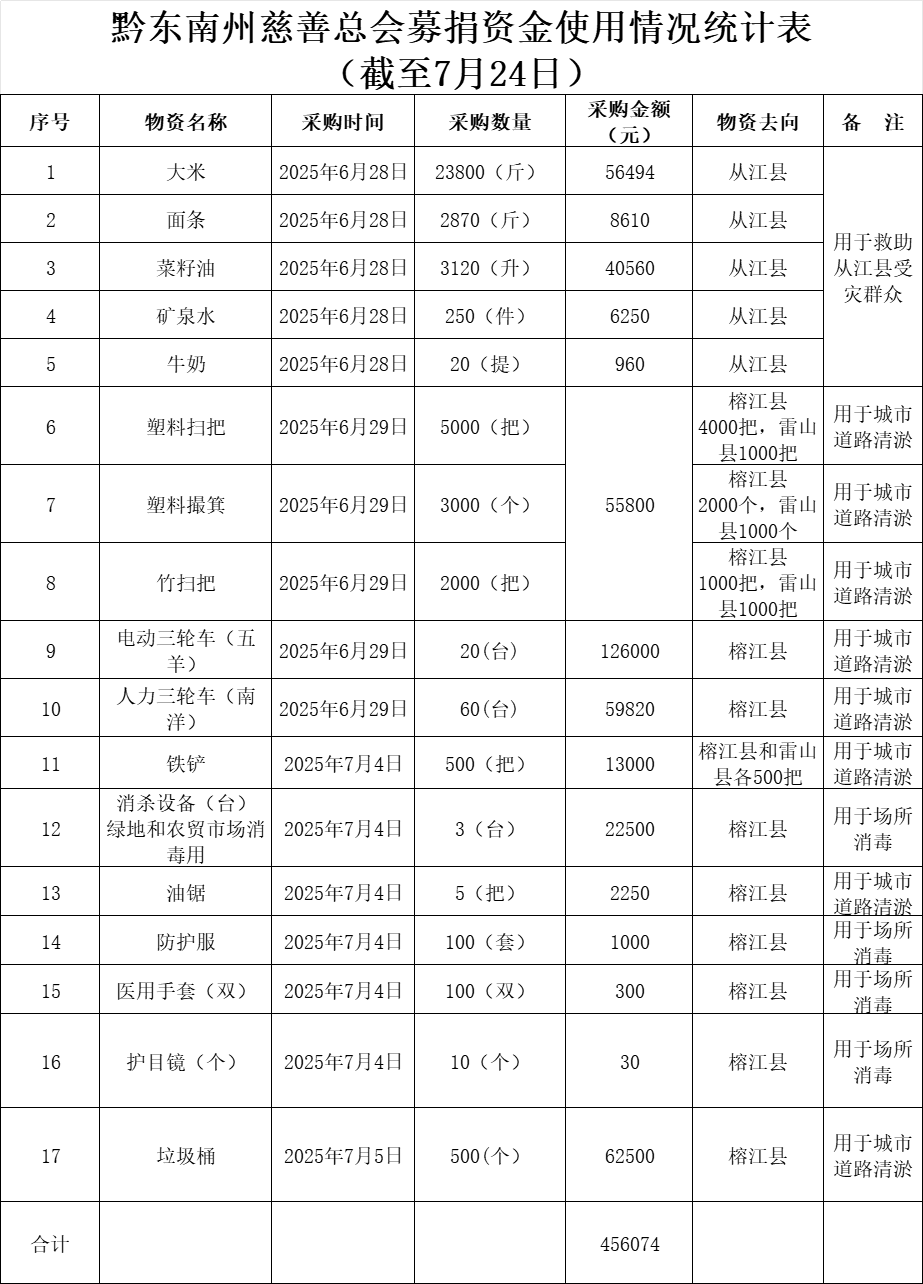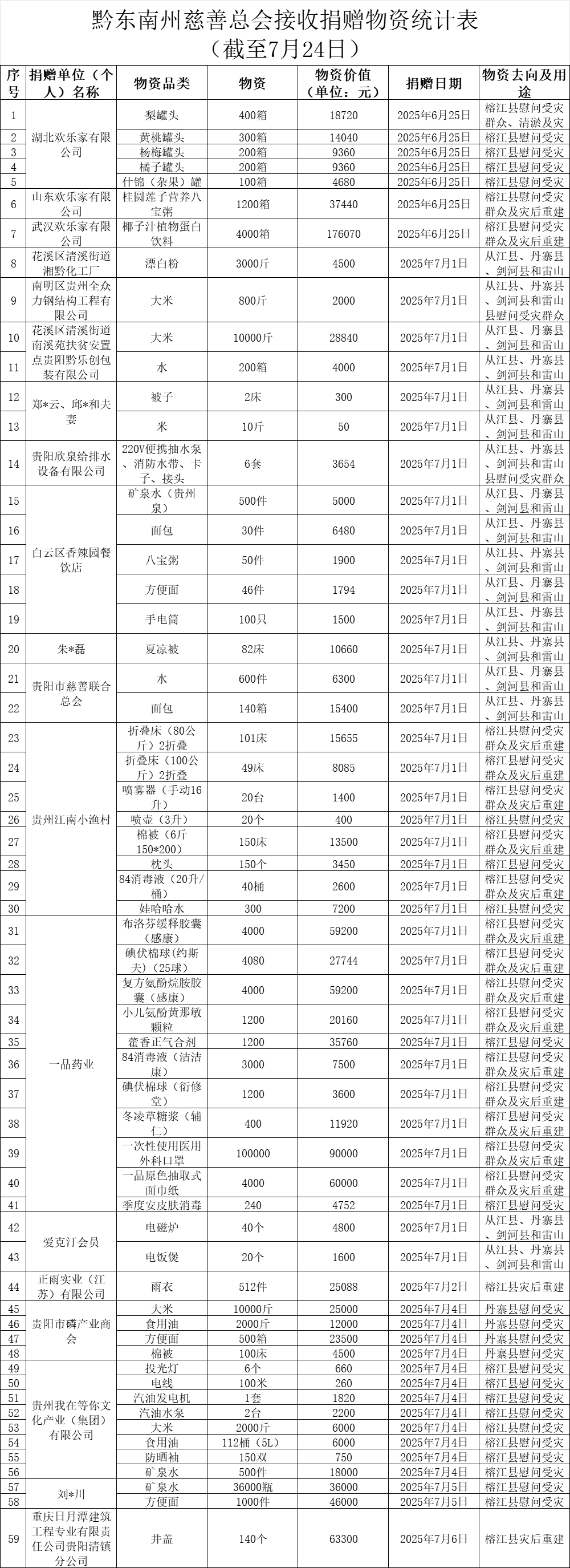 1. 资金接收情况:截至2025年7月24日16:00,累计募捐款物29571165.16元,其中:其中线下募捐资金24845265.61元(见附件1),腾讯公益平台募捐资金3654247.55元(见腾讯公益平台),募捐物资价值1071652.00元(见附件2)。2.资金使用情况:物资采购使用资金456074元(见附件3),慰问金发放1673000元(见附件4)。3.资金拨付到县情况:拨付定向捐赠榕江县资金8397930.53元,拨付定向捐赠从江县资金106571.13元4.资金结余17865937.5元,将用于受灾群众房屋重建补助及其他灾后恢复重建公益项目。(一)资金使用承诺:所有善款及物资将严格按照捐赠计划方案,用于帮扶受灾群众的基本生活,帮助受灾群众房屋损毁恢复重建等。我们会定期公开使用情况,接受社会监督。https://cszg.mca.gov.cn/platform/login.html及黔东南民政公众号。附件:1. 黔东南州慈善总会接收线下募捐名单(截至7月24日)2. 黔东南州慈善总会接收捐赠物资统计表(截至7月24日)3. 黔东南州慈善总会募捐资金使用情况统计表(截至7月24日)4.黔东南州慈善总会慰问受灾群众名单公示(第一批)
