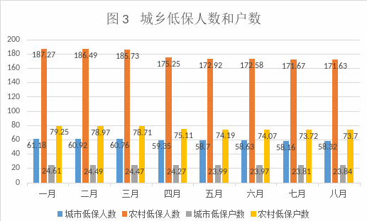8月份末,全省农村居民最低生活保障户数73.70万户,人数为171.63万人,比2022年7月份减少0.05万人。