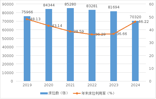 截至2024年底,全省共有养老服务机构756个,比上年下降15.63%,养老机构床位数70320张,比上年下降13.92%,年末在院人数32505人。
