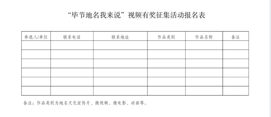 (一)参选作品请于2025年7月1日至2025年8月31日完成报送,并附《“毕节地名我来说”视频有奖征集活动报名表》(见附件);