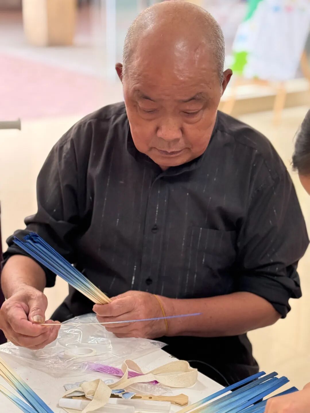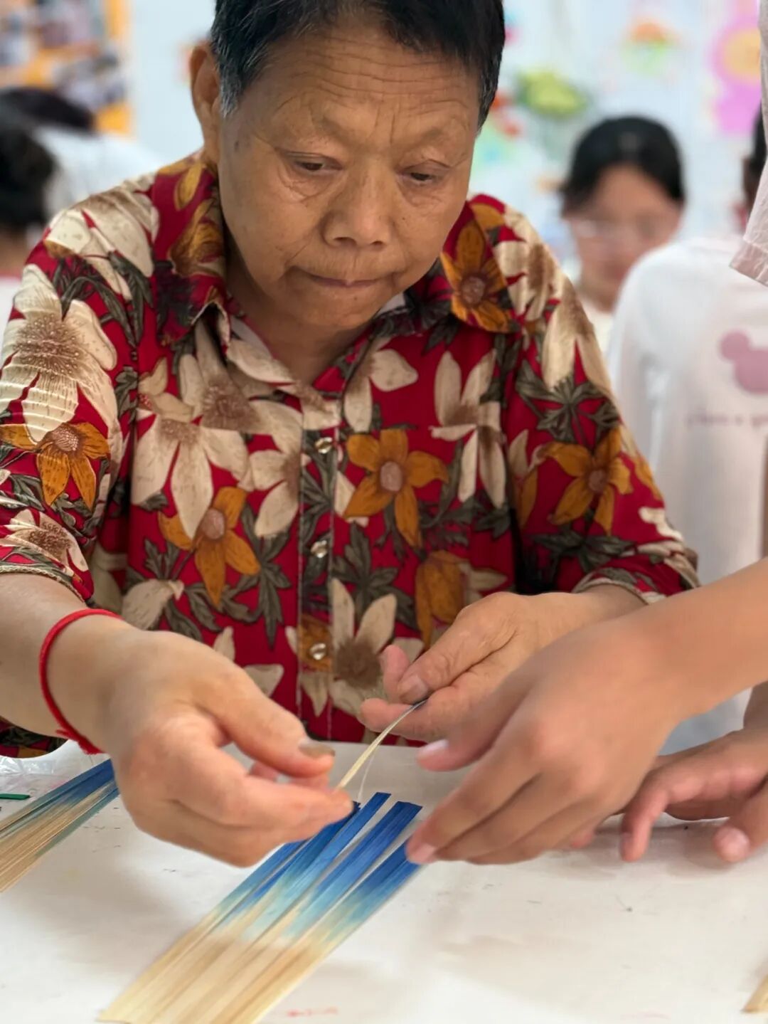 这时,老人们总会放缓语速,耐心抽走错位的竹丝,再把柔软的竹丝轻轻塞进孩子指间,自己的手则在外侧小心护着,一点点引导孩子将竹丝从对应的孔洞穿过,动作里满是不疾不徐的温柔。