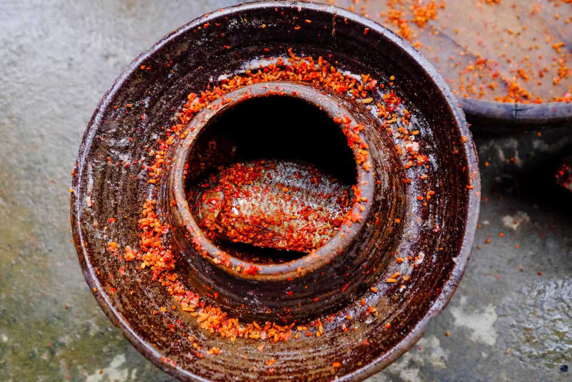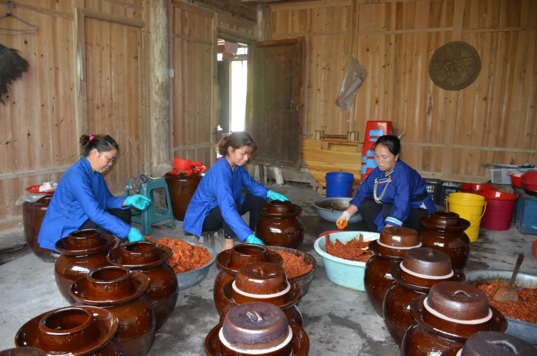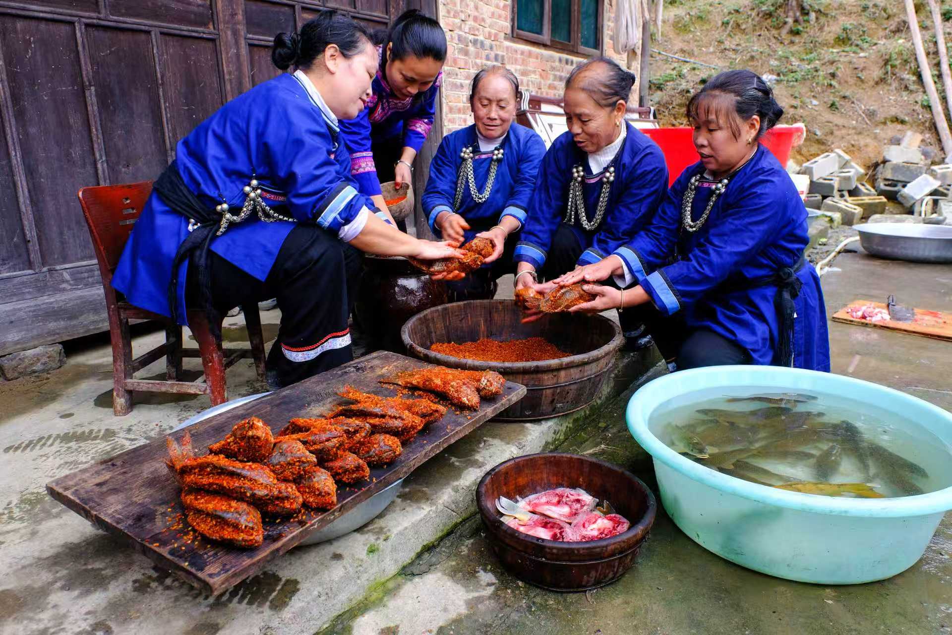 石洞腌鱼是北侗文化的味觉符号,其制作技艺与侗族人民的生活哲学紧密相连。腌鱼技艺通过代际传承保留了侗族先民应对山区环境的生存智慧。每年农历六月,当稻田里的鲤鱼饱餐稻花后,石洞镇家家户户都会开启一年一度的腌鱼季。石洞腌鱼的特色,藏在“选、腌、存、食”的每一个细节里。原料选用当地溪河中的稻田鱼或山塘鲤鱼,这类鱼生长缓慢,肉质紧实、刺少味鲜,是腌鱼的最佳载体。处理鱼时,需去鳞去鳃但保留完整鱼身,用清水洗净后沥干,再用食盐反复揉搓,挤出多余水分,这一步俗称“脱腥锁鲜”。腌制的核心在于配料,当地人会将自家种植的糯米蒸熟、晾凉后拌入酒曲发酵成甜酒,再加入辣椒粉、花椒、生姜、大蒜、山苍子等香料,其中山苍子是点睛之笔,其独特的清香能中和鱼肉的腥味,增添山野气息。将拌好的配料与鱼身层层交错装入陶坛,倒入自家酿造的米酒没过鱼身,最后用粽叶和黄泥密封坛口,送入溶洞中静置发酵,短则三个月,长则数年。