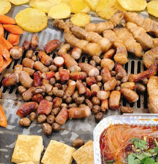 看、摊主师傅们手持长筷、锅镩,熟练地将小肠翻面,“滋啦、滋啦——”一声声脆响,暗红的炭火窜起金黄的火苗,油花四溅处,焦香与辣意裹挟着折耳根的独特气息扑面而来。