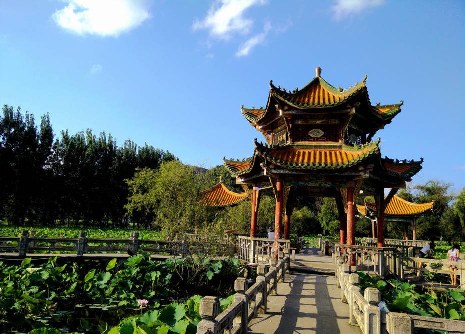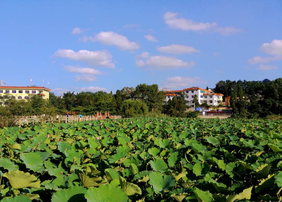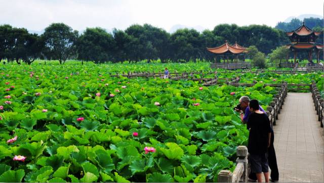 招堤堤南是稻,一片绿植直抵城厢;堤北是荷,水洁荷净舞翠摇红。盛夏,百亩荷花红绿相映,亭桥浮出花海,轻风一过,馨香袭人。