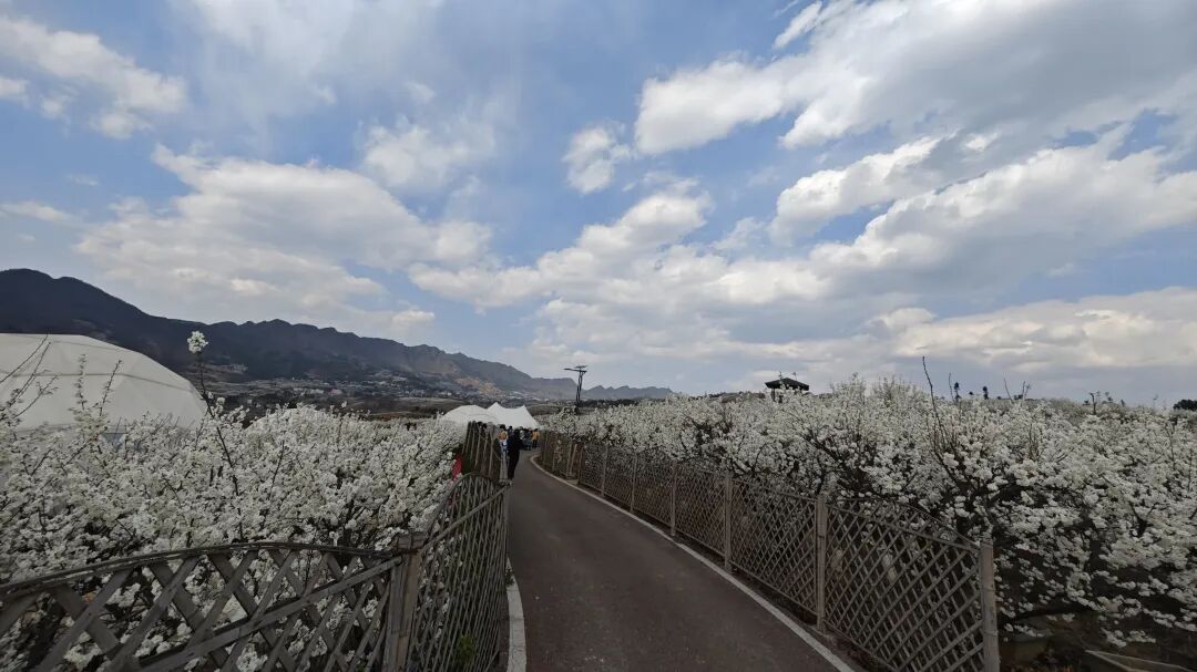 春风轻轻拂过河谷两岸,雪白的花潮涌动,一眼望去,尽是温柔烂漫;漫步花间,步步皆是诗意。