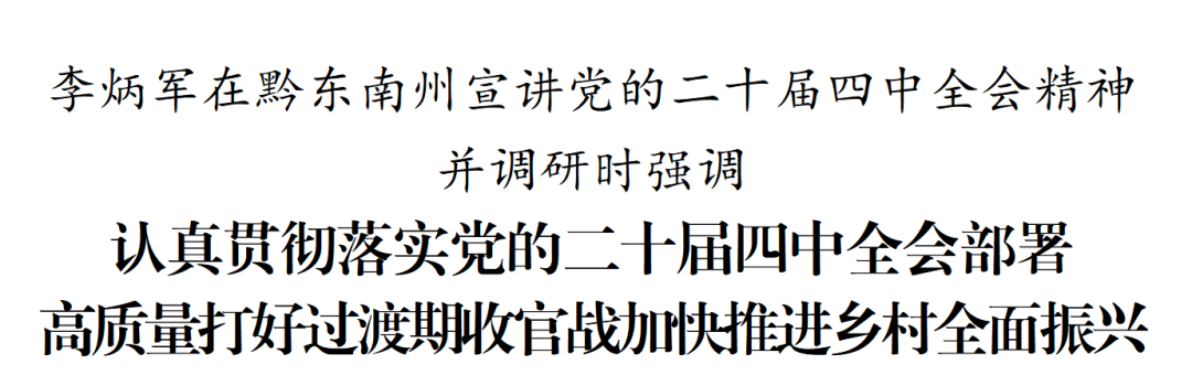 11月10日至11日,省委副书记、省长李炳军到黔东南州天柱县、锦屏县,宣讲党的二十届四中全会精神并调研。他强调,要深入学习贯彻党的二十届四中全会精神和习近平总书记在贵州考察时的重要讲话精神,高质量打好过渡期收官战,加快推进乡村全面振兴。省领导李建参加。