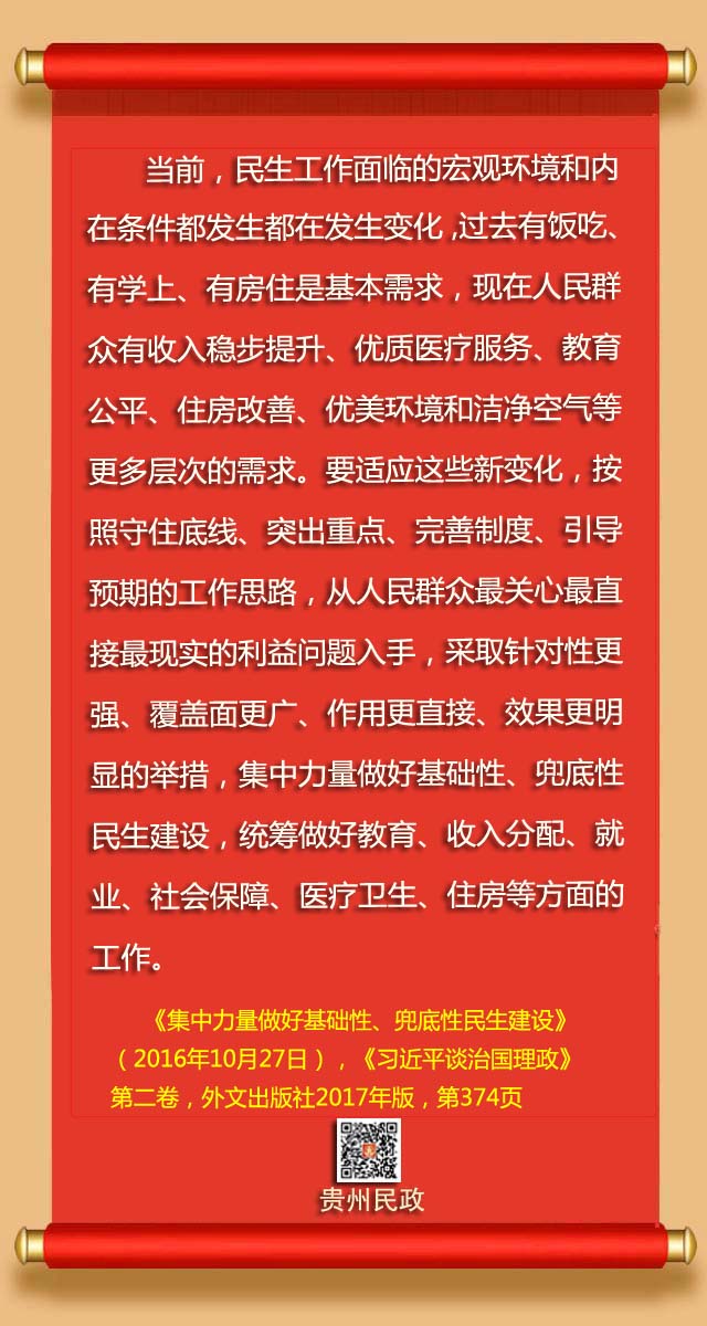 习近平总书记指出,民政工作关系民生、连着民心。党的十八大以来,以习近平同志为核心的党中央从战略和全局高度加强党对民政工作的领导,坚持以人民为中心,加强普惠性、基础性、兜底性民生建设,解决好人民最关心最直接最现实的利益问题,推动民政事业持续健康发展。习近平总书记围绕民政工作发表了一系列重要论述。为帮助广大干部群众准确学习、理解、把握习近平同志有关重要论述,中央文献出版社编辑了《习近平关于民政工作论述摘编》。为进一步深入学习宣传贯彻好习近平关于民政工作的重要论述,贵州省民政厅通过政务新媒体开设《学习时间》专栏,与大家一起深入学习习近平总书记关于民政工作重要论述。今天推出第042期: