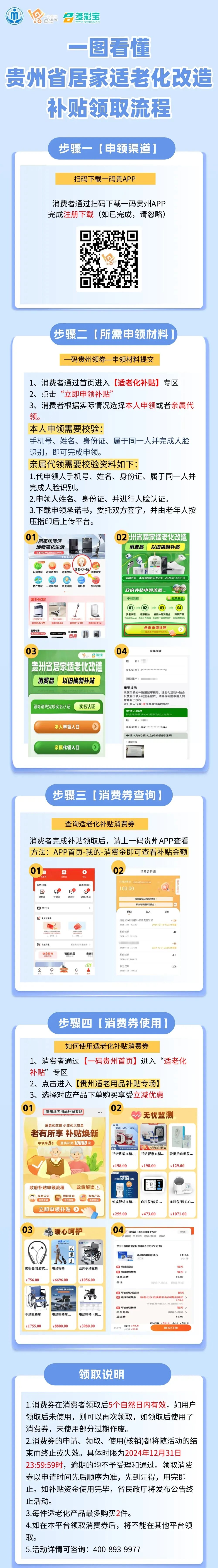 贵州省民政厅正式开启发放居家适老化改造消费券 对全省60岁及以上的老人(1964年12月31日及以前出生)且收货地址在贵州省境内 在参与活动的平台或商家购买居家适老化产品时 进行补贴 补贴标准为购买适老化产品单价的50% 最高满减10000!领取流程如下:
